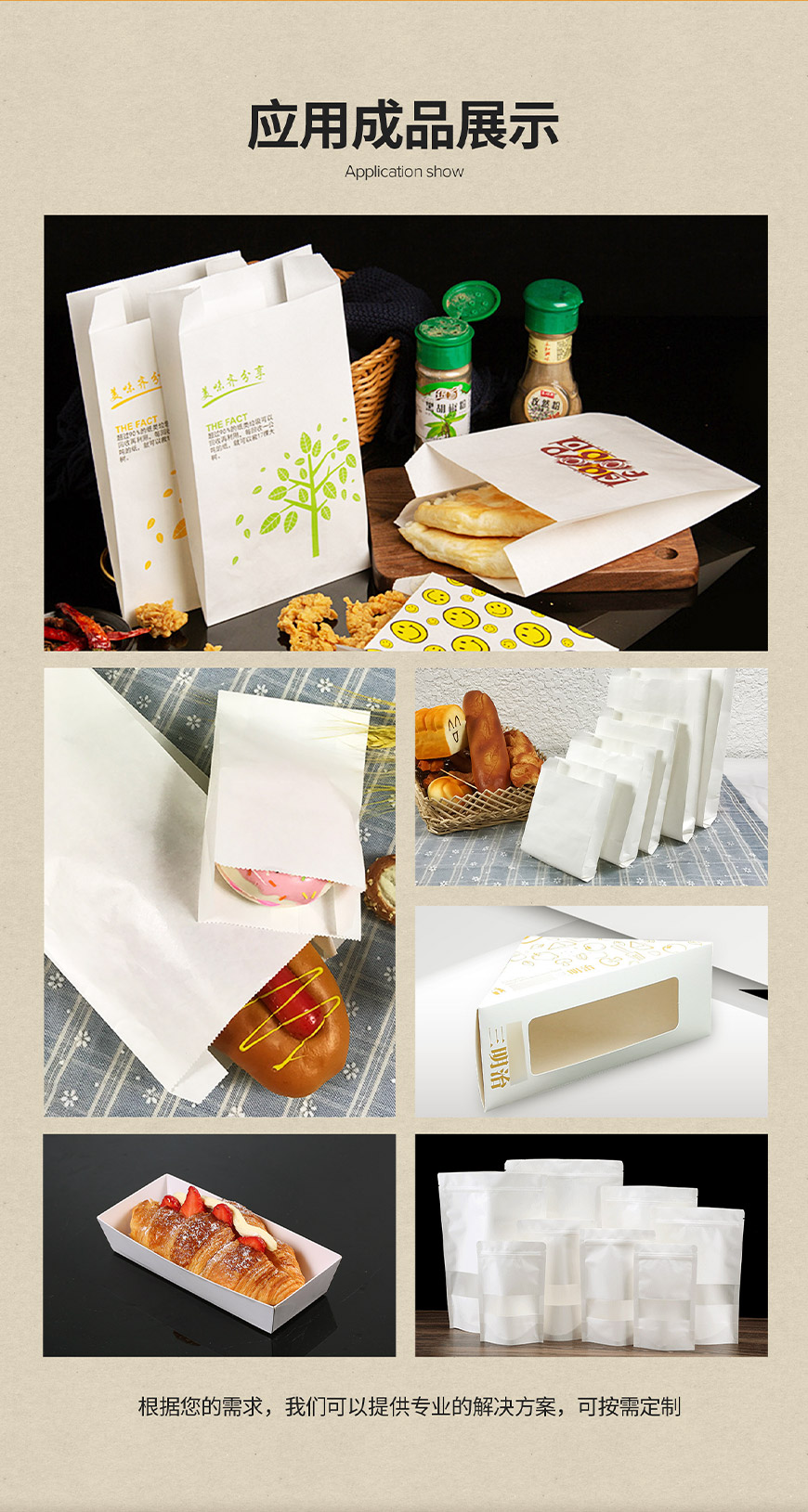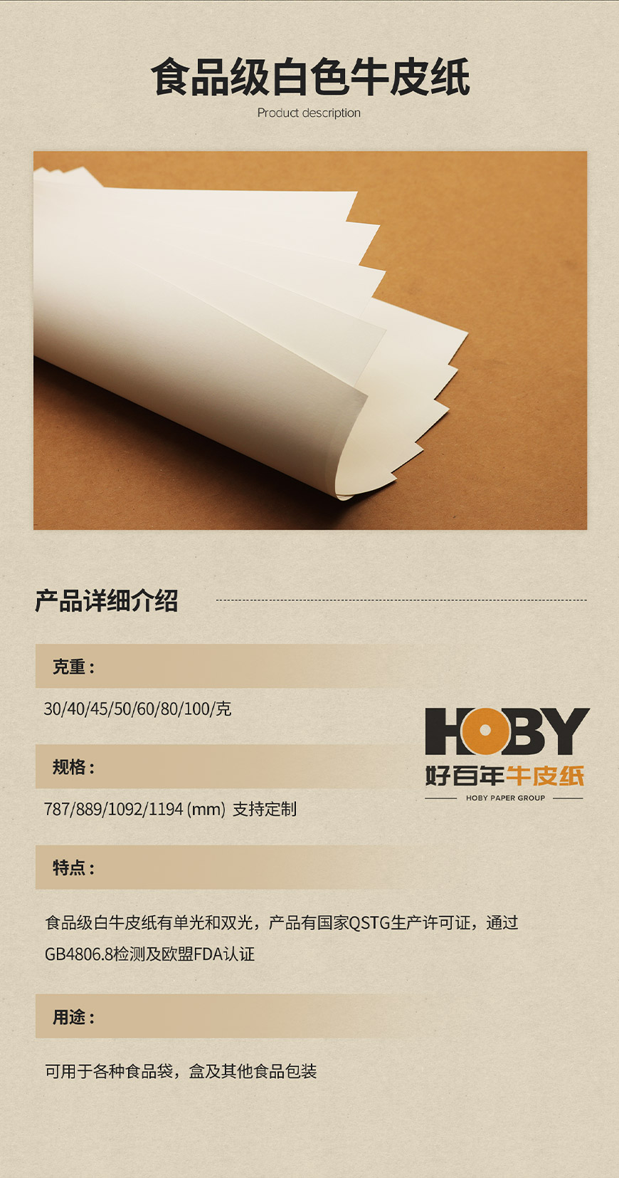 | 特點 | 食品級白牛皮紙有單光和雙光,產(chǎn)品有國家QSTG生產(chǎn)許可證,通過GB4806.8檢測及歐盟FDA認證,可用于各種食品袋,盒及其他食品包裝。 |